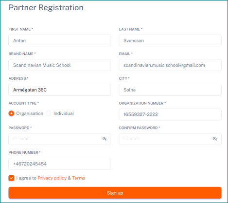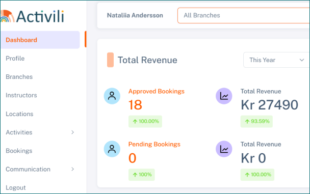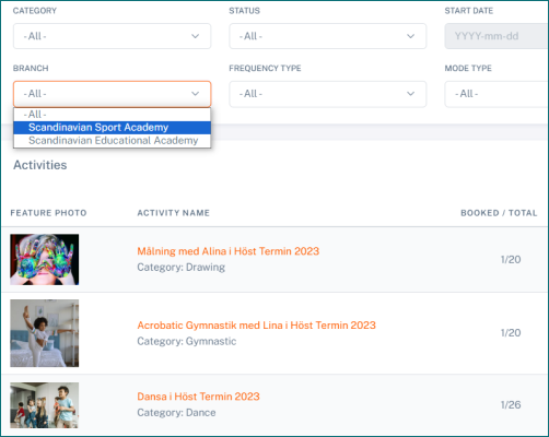 - Hantering av flera filialer: Partners kan enkelt registrera och hantera flera filialer, var och en med sina aktivitetstyper, platser och betalningsmetoder.