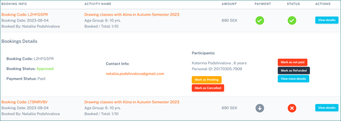 - Följ bokningar: Få en tydlig översikt över bokade och totala platser för varje aktivitet och hantera alla relaterade bokningar från en central plats.