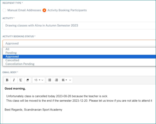 - Fakturahantering: Skicka enkelt fakturor till deltagare i kurser eller evenemang, eller till dem som väntar på godkännande av avbokningsförfrågningar, vilket effektiviserar ekonomiska transaktioner.