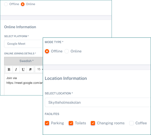 - Problemfri onlineupplevelse: För onlineaktiviteter, specificera plattformen ni vill använda och anslutningsdetaljerna. Användarna får länken efter bokningsgodkännande, vilket säkerställer enkel åtkomst.