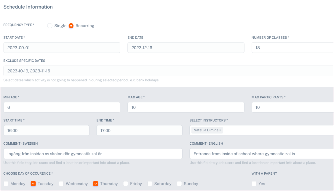- Tidsscheman och kapacitet: Ange aktivitetstider, maximalt antal deltagare och specificera veckodagar för att effektivisera schemaläggningen.