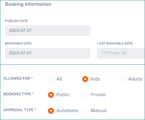 - Bokningstyper: Välj mellan ”Offentlig” och ”Privat” som bokningstyp. Offentliga aktiviteter är synliga för alla, medan privata kräver en länk för åtkomst.